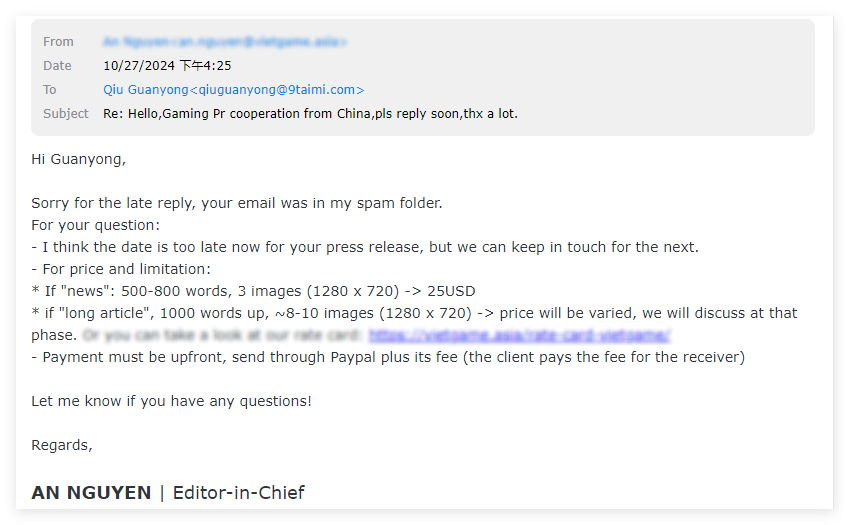 11月27日,金孚媒Kinfoom Presswire帮助国内某游戏企业寻找越南的游戏媒体,通过专业工具查询了解到,越南的游戏媒体Vietgame非常知名,而且性价比非常高,是一家优质的游戏媒体,推荐给了客户,并成功达成了新闻稿(客户新产品上市)的发布合作。