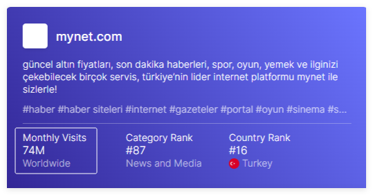Mynet是土耳其互联网用户最喜欢的数字平台,位于国际知名城市伊斯坦布尔,自 1999 年以来一直保持领先地位。 Mynet作为领先的互联网巨头,在其领域取得了众多第一,持续支持土耳其数字生态系统的发展和发展。Mynet 的社交网络受众总数已超过2000万,每月平均有4200万互联网用户,7400万访问量,Mynet 每月允许访问者观看超过1亿个视频。